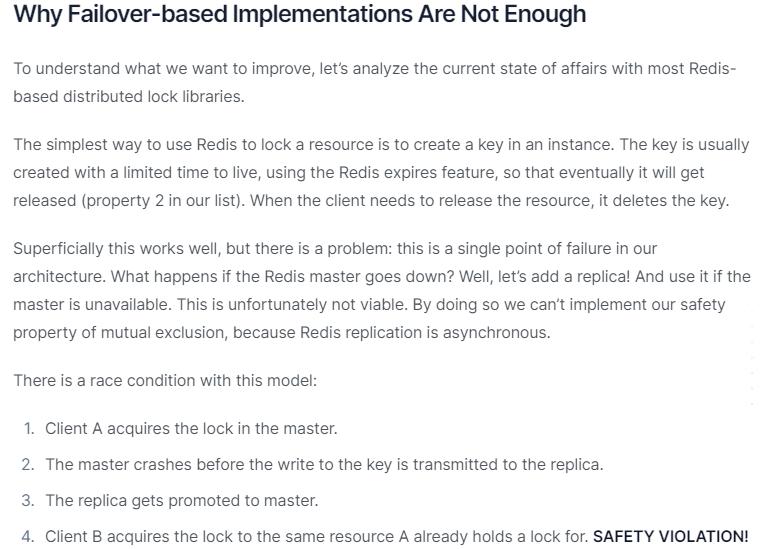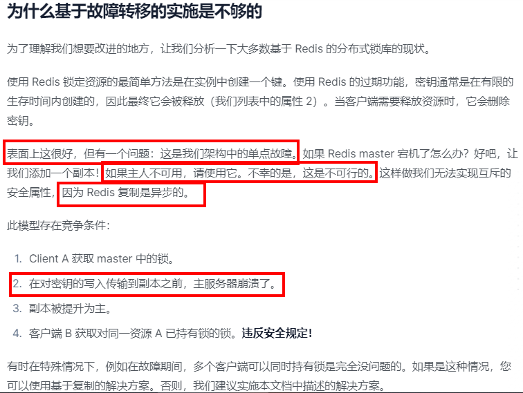 - 线程 1 首先获取锁成功,将键值对写入 redis 的 master 节点,在 redis 将该键值对同步到 slave 节点之前,master 发生了故障;redis 触发故障转移,其中一个 slave 升级为新的 master,此时新上位的master并不包含线程1写入的键值对,因此线程 2 尝试获取锁也可以成功拿到锁,此时相当于有两个线程获取到了锁,可能会导致各种预期之外的情况发生,例如最常见的脏数据。