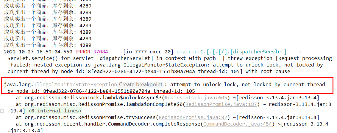 @Operation(summary = "扣减库存saleByRedisson,一次卖一个") @GetMapping(value = "/inventory/saleByRedisson") public String saleByRedisson() { return inventoryService.saleByRedisson(); }1
