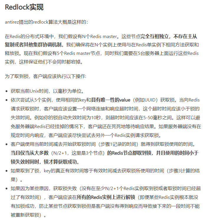 redis之父提出了Redlock算法解决这个问题:Redis也提供了Redlock算法,用来实现基于多个实例的分布式锁。锁变量由多个实例维护,即使有实例发生了故障,锁变量仍然是存在的,客户端还是可以完成锁操作。Redlock算法是实现高可靠分布式锁的一种有效解决方案,可以在实际开发中使用。最下方还有笔记