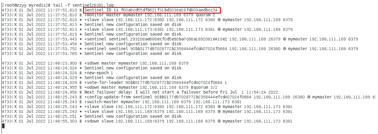 sentinel monitor mymaster 192.168.111.169 6379 2