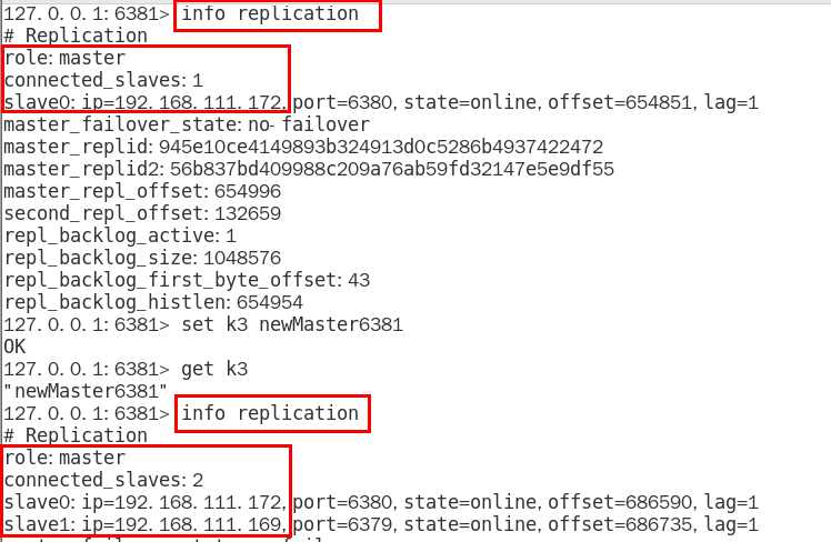• 将之前已下线的老master设置为新选出的新master的从节点,当老master重新上线后,它会成为新master的从节点