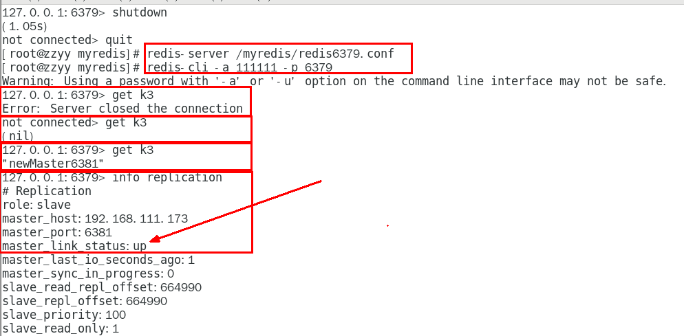 • 我们自己手动关闭6379服务器,模拟master挂了