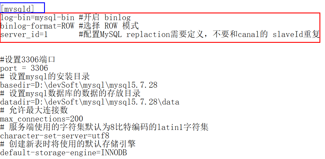 my.inilog-bin=mysql-bin #开启 binlog binlog-format=ROW #选择 ROW 模式 server_id=1 #配置MySQL replaction需要定义,不要和canal的 slaveId重复1