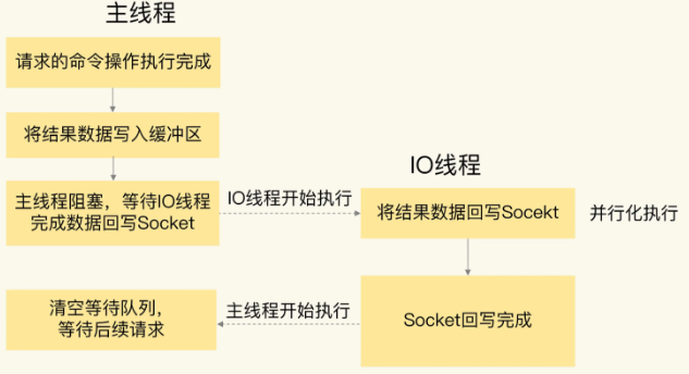 从Redis6开始,就新增了多线程的功能来提高 I/O 的读写性能,他的主要实现思路是将主线程的 IO 读写任务拆分给一组独立的线程去执行,这样就可以使多个 socket 的读写可以并行化了,采用多路 I/O 复用技术可以让单个线程高效的处理多个连接请求(尽量减少网络IO的时间消耗),将最耗时的Socket的读取、请求解析、写入单独外包出去,剩下的命令执行仍然由主线程串行执行并和内存的数据交互。